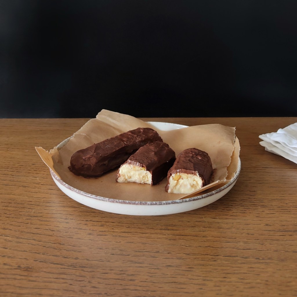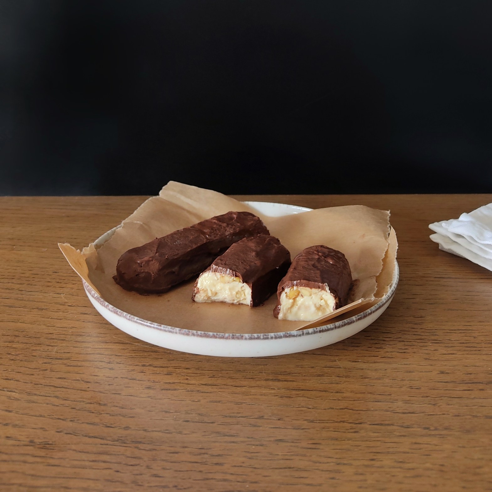 Faîtes fondre le chocolat avec le lait, puis laissez-le refroidir quelques instants. Ensuite, enrobez les barres de chocolat et placez-les au congélateur durant 2 heures.