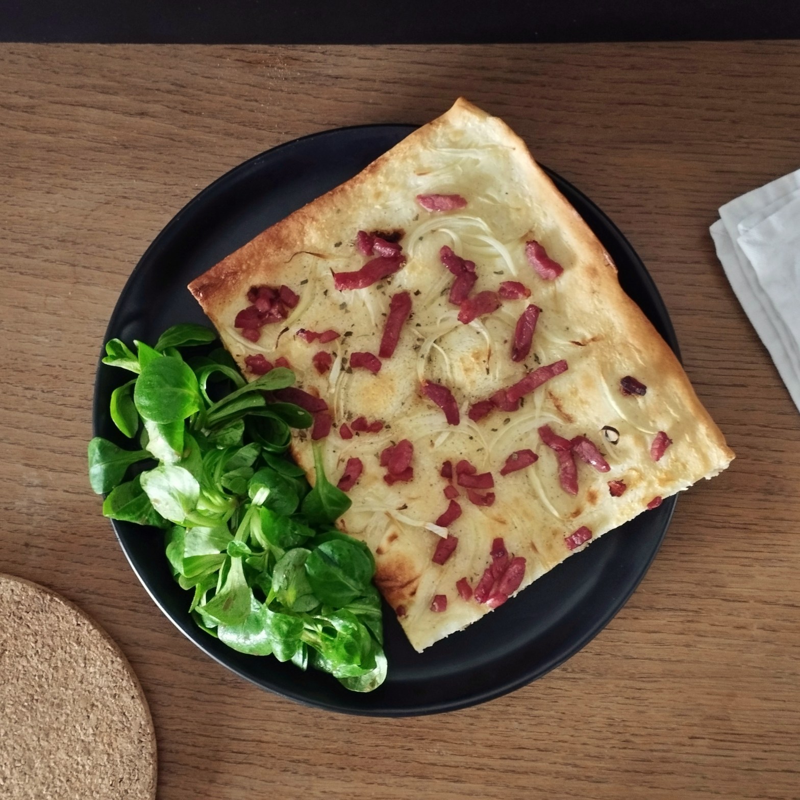 Etalez la crème fraîche sur la pâte à pizza, parsemez de lardons et d’oignon, et poivrez.